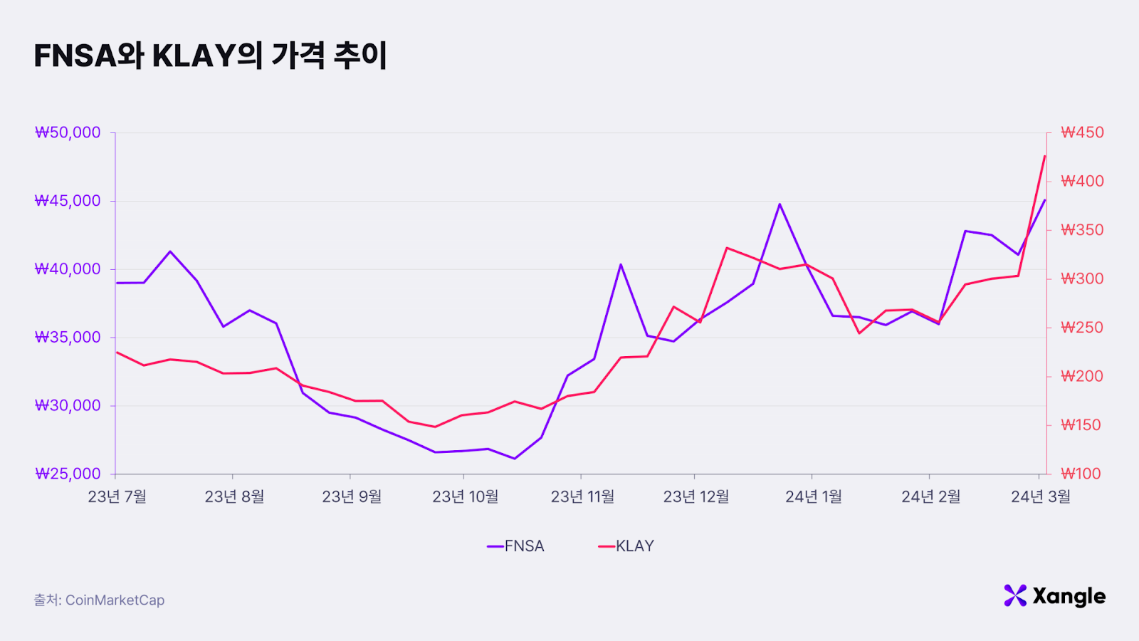 2023년 3분기 가격 하락을 보였던 핀시아와 클레이는 4분기에 접어들며 다시 가격을 회복하였다. 지난 1월 16일 합병 제안 게시와 2월 15일 투표 가결 등 합병 관련 소식이 알려진 직후 가격이 상승하였다 급락하는 등 변동성이 커지는 모습을 보였는데, 이는 더이상 상승 재료가 없다고 판단한 투자자들이 급격히 많은 물량을 매도하였기 때문으로 보인다. 그러나, 투표 기간 중 250원대까지 하락한 클레이의 가격이 400원을 돌파하는 등, 합병이 확정되고 두 코인 모두 안정적인 상승세를 보였다.