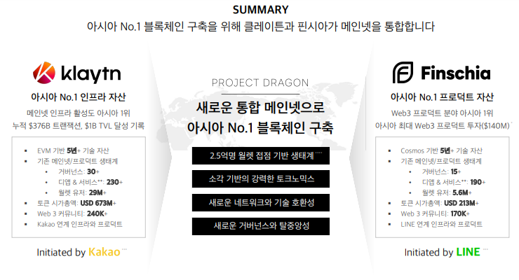 핀시아와 클레이튼이 결합한 드래곤은 LINE과 카카오 메신저의 2.5억명의 유저를 기반으로, 웹3 자산을 연결하고 아시아 레이어 1 시장을 통합하는 생태계 구축을 목표로 한다. 두 체인의 자산이 더해지면 통합 체인은 시총 1조 4천억원, 420개 이상의 디앱과 45개 이상의 거버넌스 파트너를 보유하게 된다.